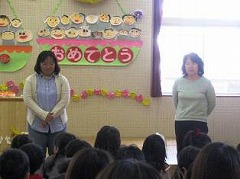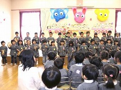 最後に年長ぐみからお祝いのメッセージとおもちゃんのチャチャチャの合奏のプレゼントがありました。