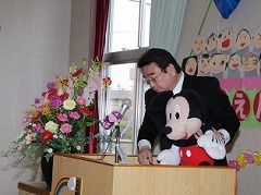八小の高橋大造校長先生、ミッキーを連れてきてくれました。魔法でミッキーがどんどん大きくなったり絵本に色をぬってくれました。第八小学校にプールなどで遊びに来てくださいねとお話がありました。