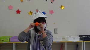 ◇「かぶと」 大きな紙で作ったよ。だーれだ?
