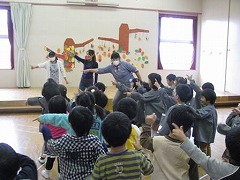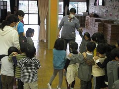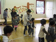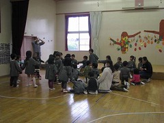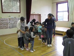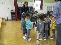 はじめは、「猛獣狩りに行こうよ」のゲームです。動物のなまえの数の人数で集まります。すみれ組、つくし組が入り混じってグループを作っていました。