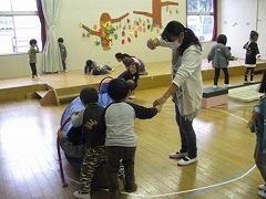 次は「じゃんけん列車」です。 じゃんけんがテンポよく出せるようになってきて、おもしろさがわかってきた年少組の子どもたち。最近は「どんじゃんけん」や「やきいもぐーちーぱー」などじゃんけんで遊ぶゲームを楽しんでいます。