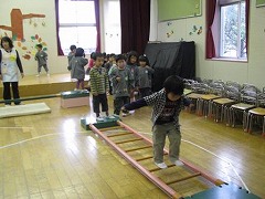 巧技台遊びでは、運動会で楽しんだ一本橋やトンネルのほかに、今日ははしごにも挑戦です。最後までバランスを上手にとって歩くことができるかな。。。