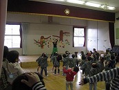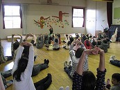 親子で一緒に柔軟をしてから、「ディズニー」の音楽に合わせて友達やお母さんと体を動かしました。