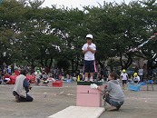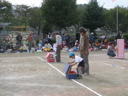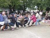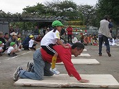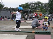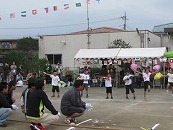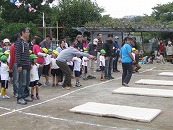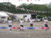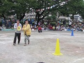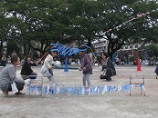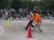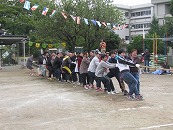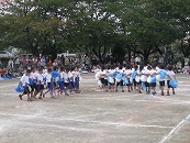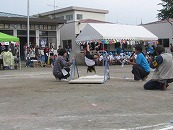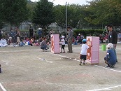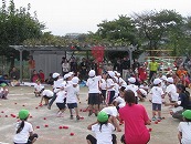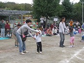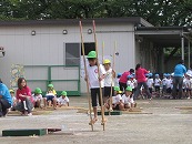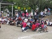 たくさんの祖父母の方々と園児が一緒に動物になって仲間集めゲームを楽しみました。 プログラム9番 保護者競技「ゴー!ゴー!つなひき」 勝負の前には年長の応援団の係の子どもたちが勇ましく応援をしてお父さん、お母さんを元気づけました。勝負は2回とも年少組チームの勝ちとなりました。 プログラム10番 年長個人競技「トライ!チャレンジ!」
