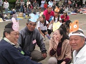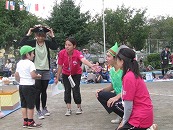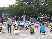 運動会の定番!借り物競争です。カードに描かれているものにお父さんお母さんが変身しました。幼稚園の職員も借り物として出演しました。 プログラム6番 年少リズム「にんじゃりばんばん」かっこいい忍者やかわいい忍者になりきって年少児がはりきって踊りました。 プログラム7番 未就園競技「ちびっこザウルス」 未就園のお友達が恐竜になってかわいい踊りを見せてくれました。 プログラム8番 全園児と祖父母によるゲーム「どうぶつむらのなかまたち」