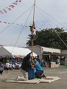 年長組が2学期初めから自分で目標を決めてチャレンジしてきた「なわとび」「てつぼう」「のぼりぼう」「たけうま」の技を披露しました。目標に向かって挑戦する勇気やあきらめずに頑張る心を身に着けた年長組の子どもたちです。 プログラム11番 年少親子競技「親子忍者参上!」