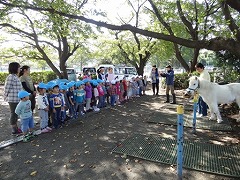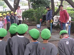 「どうして、ダンディの爪はひとつだけ、黒いの?」「ジャックとダンディが歩いた後の土の上に、どうしてハートみたいな形ができるの?」。。。と気がついたことや不思議に思ったことを聞いていた年長組。触れ合ったり背中に乗せてもらったりしながら、ジャックとダンディの様子をよく見ていたのですね。 2日目は、年少組との触れ合いです。