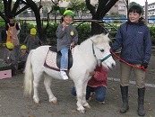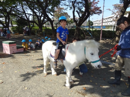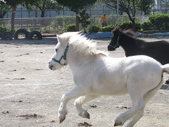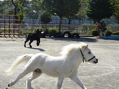 年少組も触れ合う時の約束を聞いてから、干し草を食べさせてあげます。馬を近くで見るのが初めての子が多い年少組。ドキドキしながら食べさせている子もいれば、自分から近寄り、触りたがる子もいたり。。。いろいろな姿が見られました。 年少組も乗馬体験に初挑戦です。 今日は、最後にジャックとダンディが走る姿を見せてもらいました。広い園庭を思いっきり走るジャックとダンディ。ダンディがとても気持ちがよさそうな顔で走っていますね。