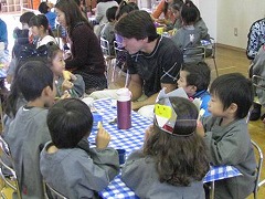 おたんじょうびおめでとうございます!また、幼稚園に遊びに来てくださいね。 誕生会の最後は、ホールでおやつパーティです。