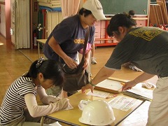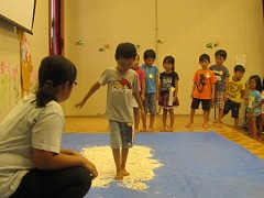 卵の殻を地震で割れたガラス等に見立てて、地震時の疑似体験をしました。ちゃんと上履きを履いていないと危ないね!とみんなで確認しました。
