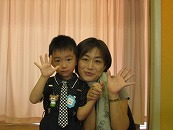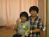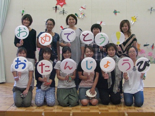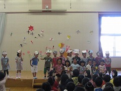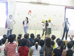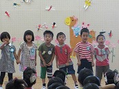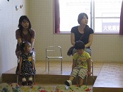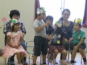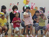 「かわるーにゃ」の合図で、お母さんたちのポーズや持ち物、身につけるものが変わったところをあてるゲームです。 お母さん方、楽しい出し物をありがとうございました。