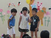 今日の進行役は、司会初挑戦のつくし組です。お友達と声を合わせて、みんなに聞こえるようにお話しよう!とがんばりました。 お誕生日のお友達に、「好きな食べ物」をインタビュー!