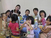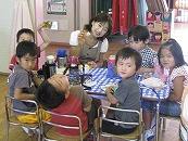 お母さん先生たちも子どもたちの輪の中に入ってもらって、いっしょにおやつを食べました。どのテーブルも、おいしいおやつを食べながら、おしゃべりがはずんでいました。