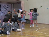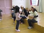 まずは、お母さん先生と4歳の担任がお姫様になって、「お姫様じゃんけんゲーム」をしました。お姫様とじゃんけんをして勝ったらお金(もちろん。紙で作ったお金です)がもらえます。4つのチームに分かれて、どのチームが一番のお金持ちになれるかを競いました。