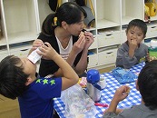 このゲームに勝つには、じゃんけんに勝つという運のよさ(?)と素早く動いてたくさんじゃんけんをするという頭と体の回転のよさも重要ですね。 後半は自分のやりたい遊びをじっくり楽しみました。 遊んだ後は、たんぽぽ組のお部屋で、友達やお母さん先生たちとおしゃべりを楽しみながら、大好きなおやつタイム!