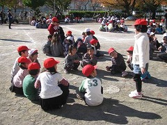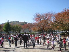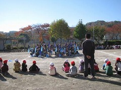 踊りを披露した後は、1年生と年長児とでグループを作ってフォークダンスを踊りました。踊る前には自己紹介をしあいました。はじめは緊張していた子も、すぐにうちとけて、自分の思っていることを1年生に伝えたり、1年生の話をにこにこしながら聞いたりする姿が見られました。
